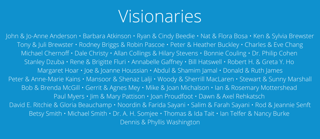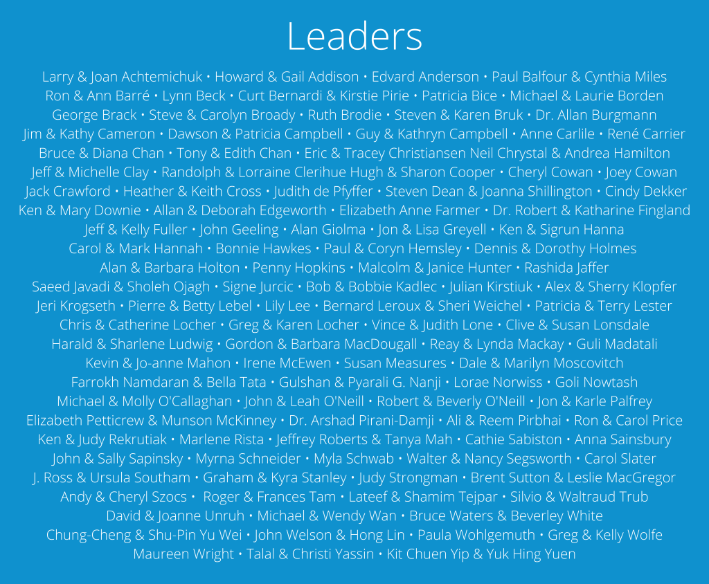 The Chair’s Circle recognizes donors whose lifetime giving has reached $100,000 or more. Lions Gate Hospital Foundation celebrates their exceptional generosity which has a deep and enduring impact on many areas of patient care at LGH.